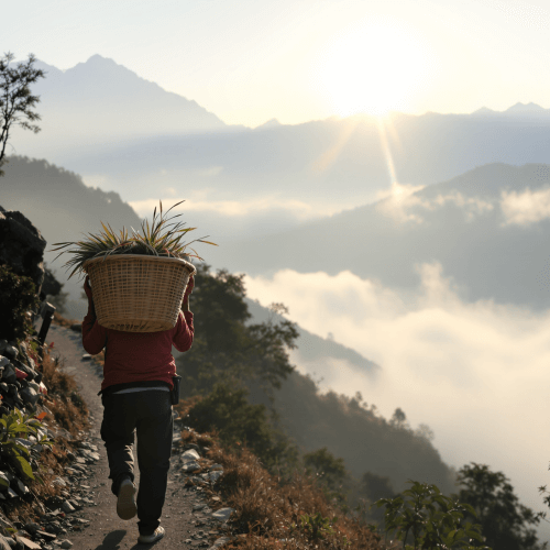 Quando nel pomeriggio scende con un cesto pieno di piante raccolte con cura, il sole si nasconde lentamente dietro le vette. È così che le erbe dell'Himalaya arrivano dalle vette inaccessibili alla sua casa: con una storia, una lunga tradizione e, soprattutto, una profonda conoscenza e un amore infinito per la natura.