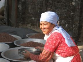 «Sono felice di lavorare qui da nove anni. Mi piace il modo in cui condividiamo la nostra produzione, come se fossimo una famiglia», dice Sangeeta Rajthala con un sorriso. Le sue parole catturano l'atmosfera in cui vengono preparati i tè ayurvedici.