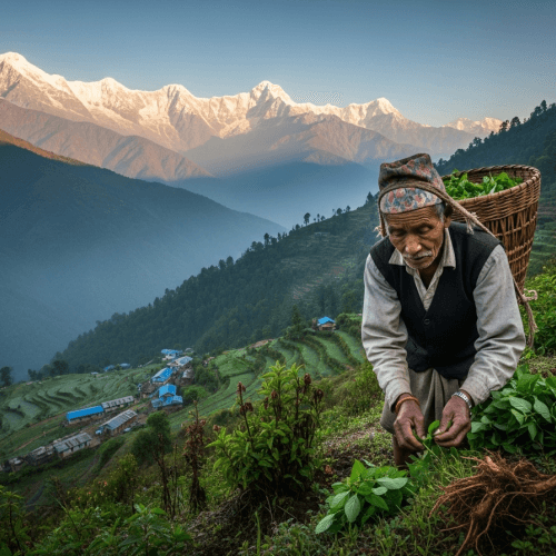 Le persone che vivono in zone montuose remote visitano regolarmente anche i villaggi situati ai piedi dell'Himalaya, portando raccolti freschi di erbe selvatiche da vendere e da lavorare successivamente. Questi pellegrini di montagna sono come ponti viventi tra il maestoso regno della natura e il frenetico mondo dei contadini. Il loro arrivo è sempre un evento, poiché non portano solo erbe, ma anche storie di luoghi che la gente comune non vede mai.