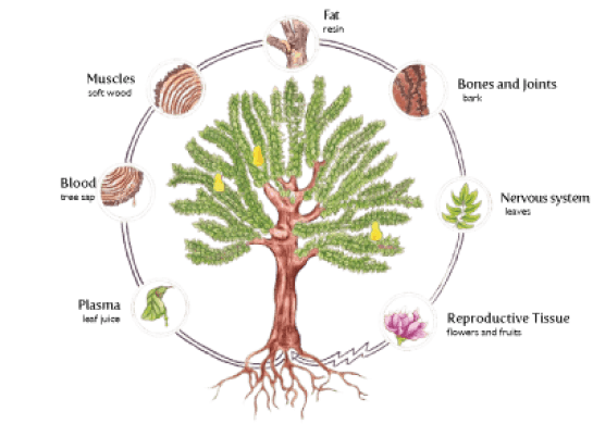 Nella medicina ayurvedica, le piante sono suddivise in sette categorie in base ai tipi di tessuto su cui agiscono. Pertanto, le singole parti delle piante possono essere assegnate ai corrispondenti tessuti del corpo umano (dhātus). Il succo delle foglie corrisponde al plasma sanguigno (rasa), la linfa rappresenta il sangue (rakta), il legno tenero corrisponde ai muscoli (mamsa), la resina è il tessuto adiposo (meda), la corteccia agisce sulle ossa e sulle articolazioni (asthi), le foglie sono legate al tessuto nervoso (majja) e, infine, i fiori o i frutti sono collegati all'attività degli organi riproduttivi maschili e femminili (shukra/arthava).